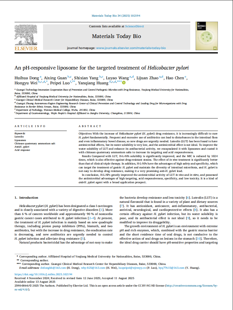 近日,我校耐药微生物感染防治研究中心黄衍强教授团队在国际知名期刊《Materials Today Bio》(影响因子10.2,中科院大小类:一区Top期刊),发表题为《An pH-responsive liposome for the targeted treatment of Helicobacter pylori》的重要研究成果。该研究研制出新型的,能靶向的作用于幽门螺杆菌尿素酶蛋白,并具有pH响应的纳米材料,使装载的木犀草素抗幽门螺杆菌疗效提高1024倍,对耐药菌也具有非常好的抗菌效果,体内效果明显优于传统三联疗法,可实现精准治疗胃部感染并保护肠道菌群多样性。此项研究为根治幽门螺杆菌感染提供了一种安全、高效、不易产生耐药的先导药物,具有非常好的转化应用前景。该论文的第一作者为我校2022 级基础医学研究生董惠华同学,这标志着我校基础医学研究生教育迈上了新的台阶。